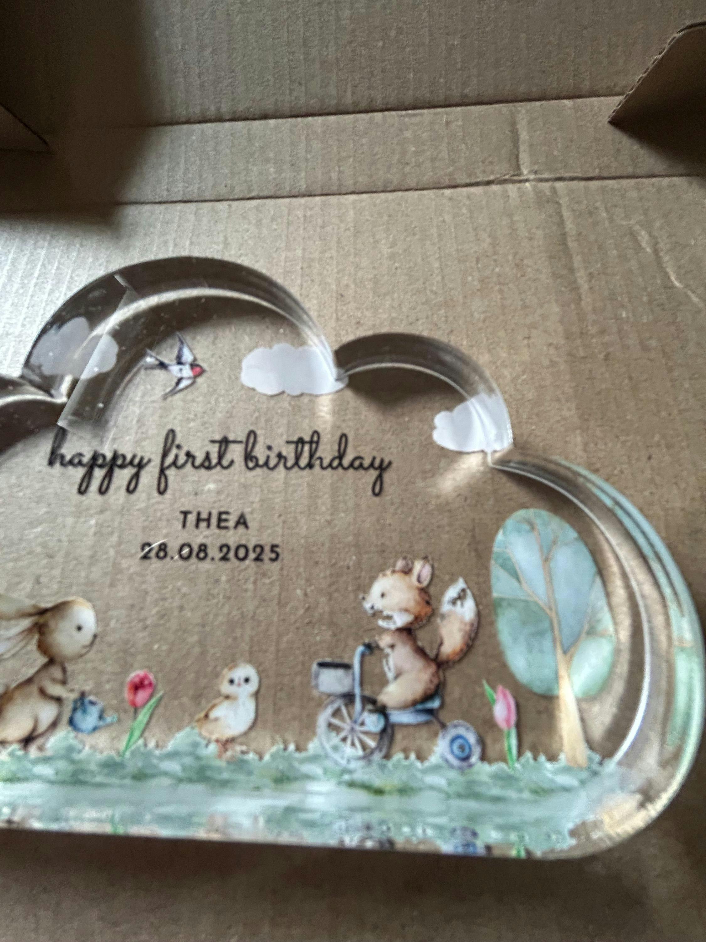 Personalised First Birthday Gift Cloud-Shaped Acrylic Keepsake with Woodland Animals A sweet and sentimental gift to mark a baby boy or girl’s 1st birthday. This charming cloud-shaped acrylic plaque features adorable woodland animals and is personalised with the child’s name and birthday date—a perfect keepsake for a nephew, niece, son, daughter, grandson, or granddaughter.