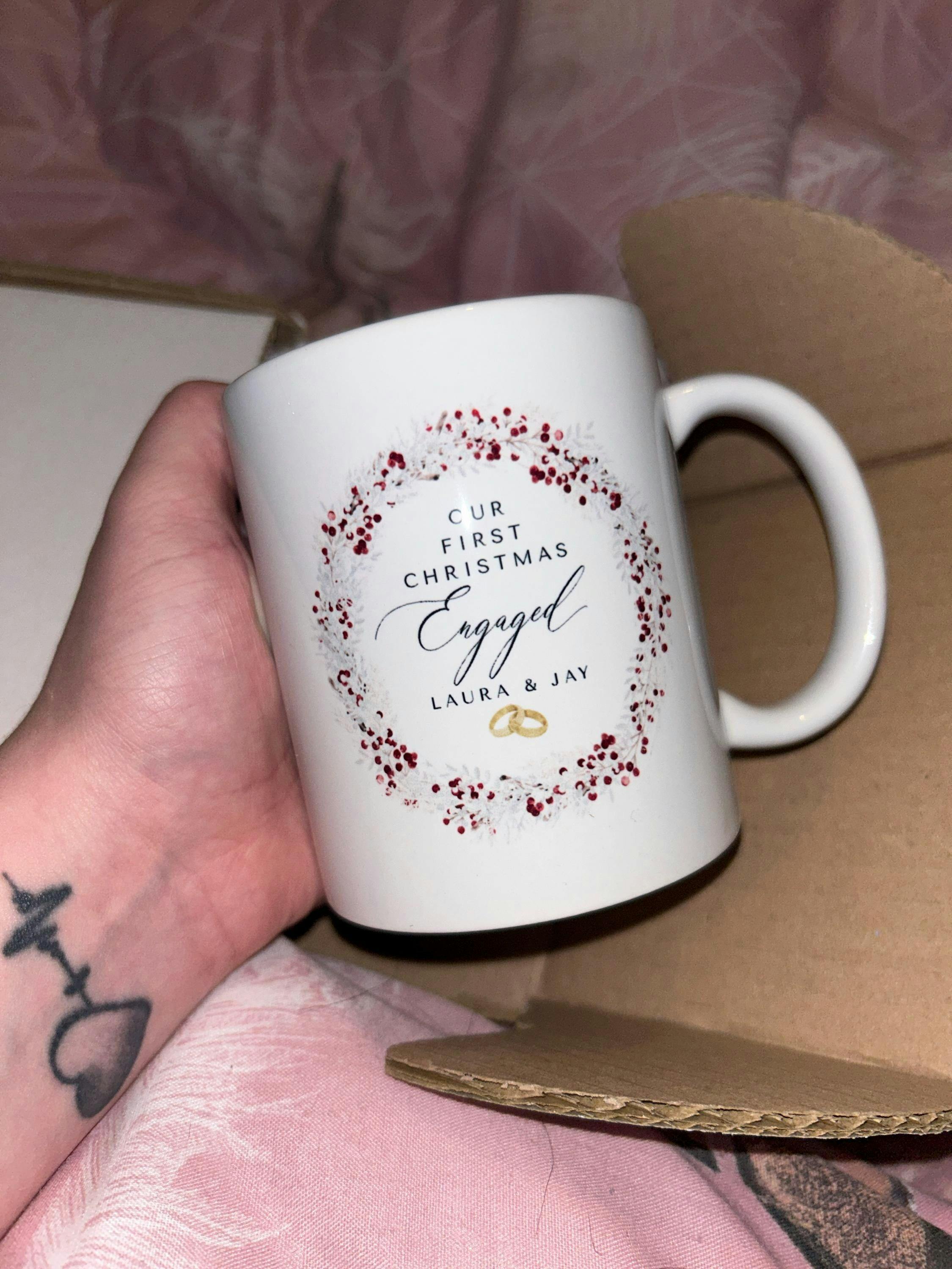Ideal for enjoying cosy drinks during the holiday season, this keepsake mug serves as a meaningful reminder of your engagement, adding warmth and joy to your Christmas celebrations. A perfect gift that will be cherished for years to come, celebrating the start of your journey together!