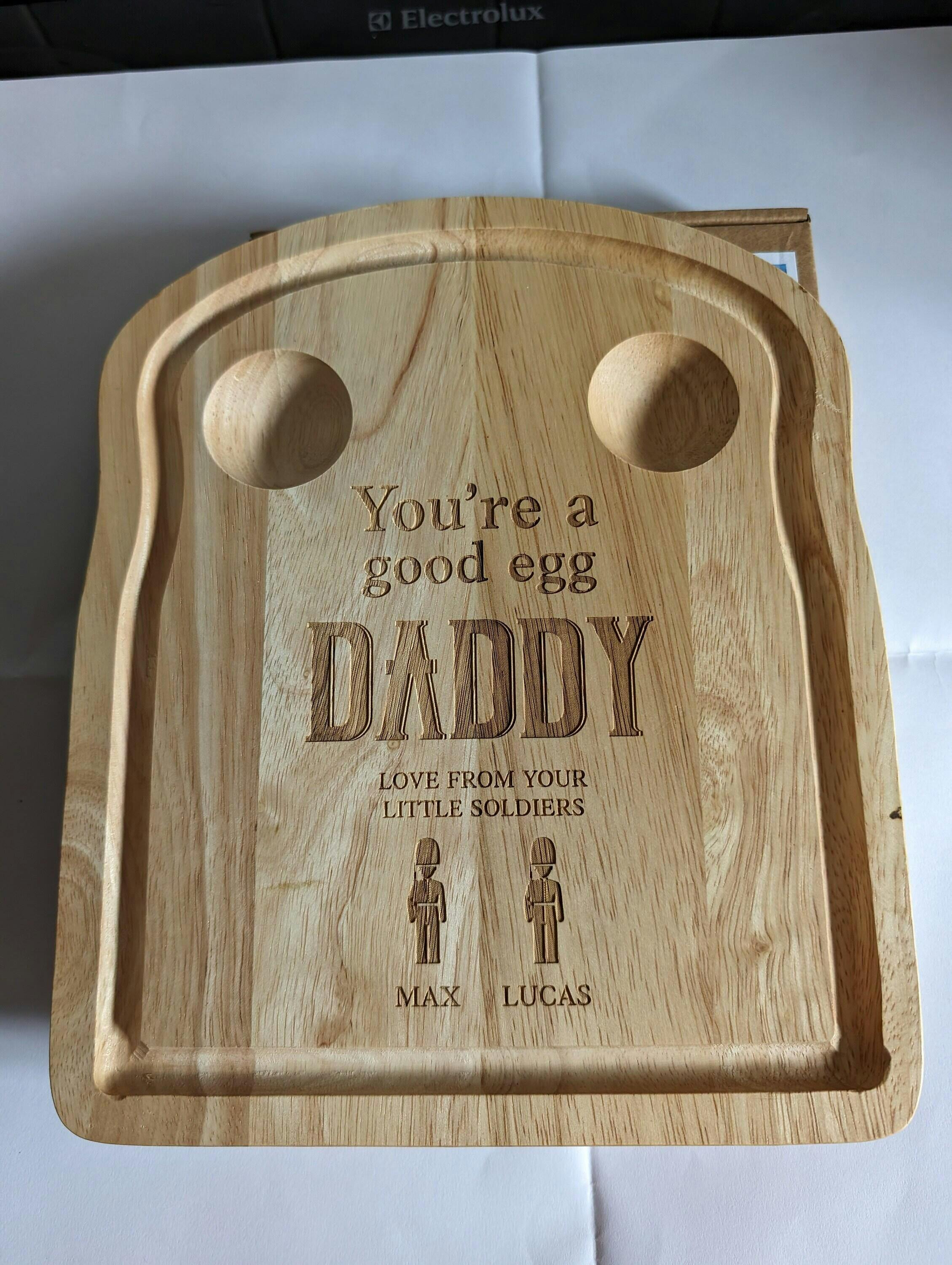 This breakfast board is made out of solid beech wood. Featuring 2 holes for eggs - the perfect modern breakfast serving board with your message.