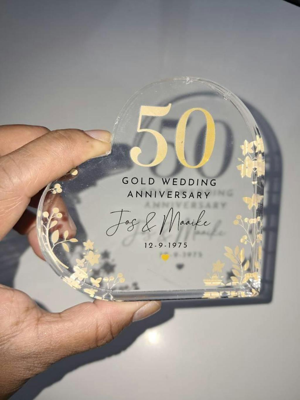 Personalised 50th Wedding Anniversary Gift Gold Anniversary Heart-Shaped Acrylic Plaque A timeless and elegant keepsake, perfect for celebrating a 50th wedding anniversary. This heart-shaped acrylic plaque is personalised with the couple’s names and anniversary dates, making it a meaningful gift for parents, grandparents, or any special couple.