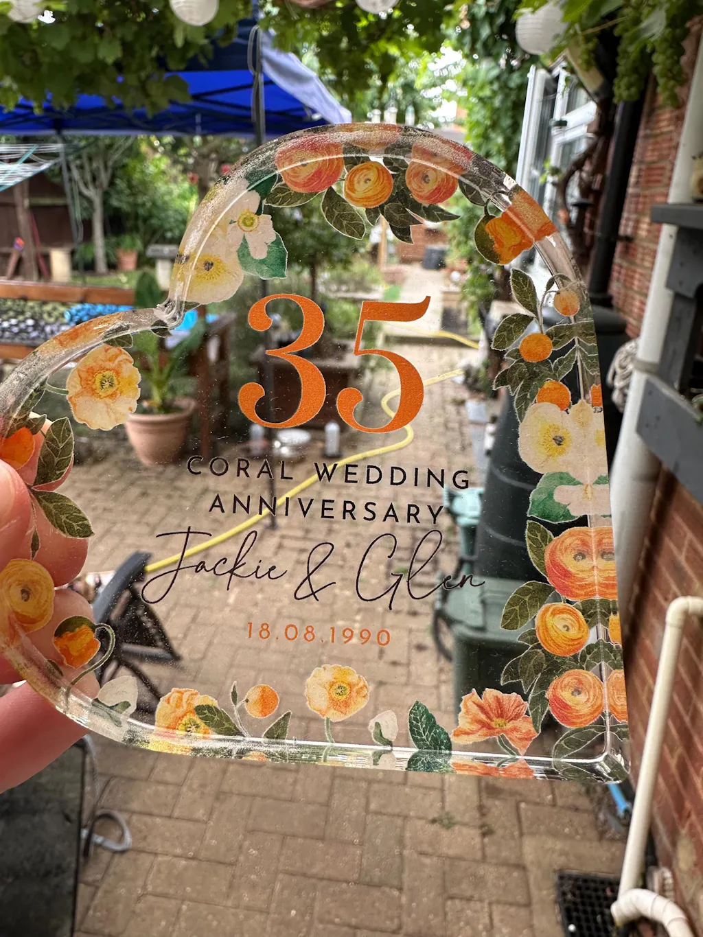 Personalised 35th Wedding Anniversary Gift Coral Anniversary Heart-Shaped Acrylic Plaque A beautiful and thoughtful keepsake, perfect for celebrating a 35th wedding anniversary. This custom heart-shaped acrylic plaque features the couple’s names, anniversary date, and an elegant floral design, symbolising lasting love and commitment.